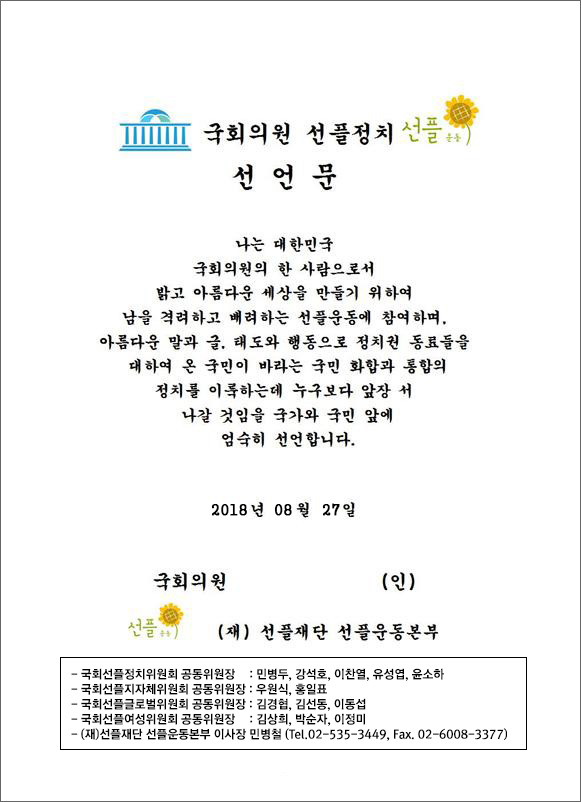 국회선플정치위원회 공동위원장 : 민병두, 강석호, 이찬열, 유성엽, 윤소하